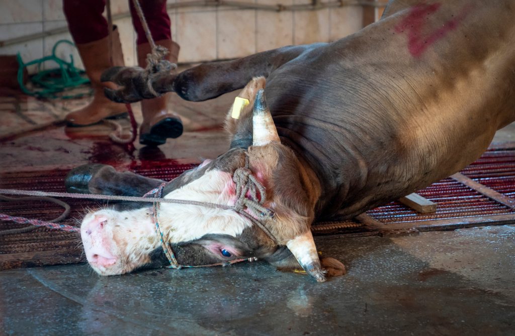 At slaughterhouses, animals will have their throats cut and many will be seeing and hearing other animals before they are killed, causing a great deal of distress.