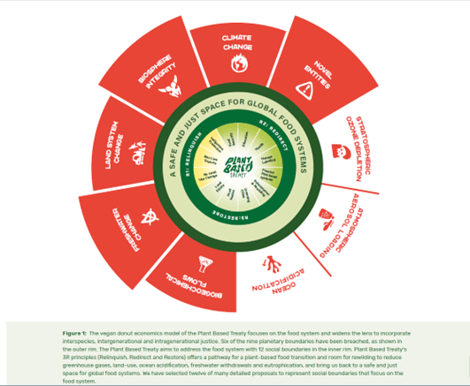 The Plant Based Treaty’s adaptation of her Doughnut Economics model is concerned with finding ways to live in the green “safe and just” space within ecological limits while allowing communities to thrive in building the vegan world (which will solve all our major global crises, not just our climate crisis) with a transformation of the food system. The report says the following about this: