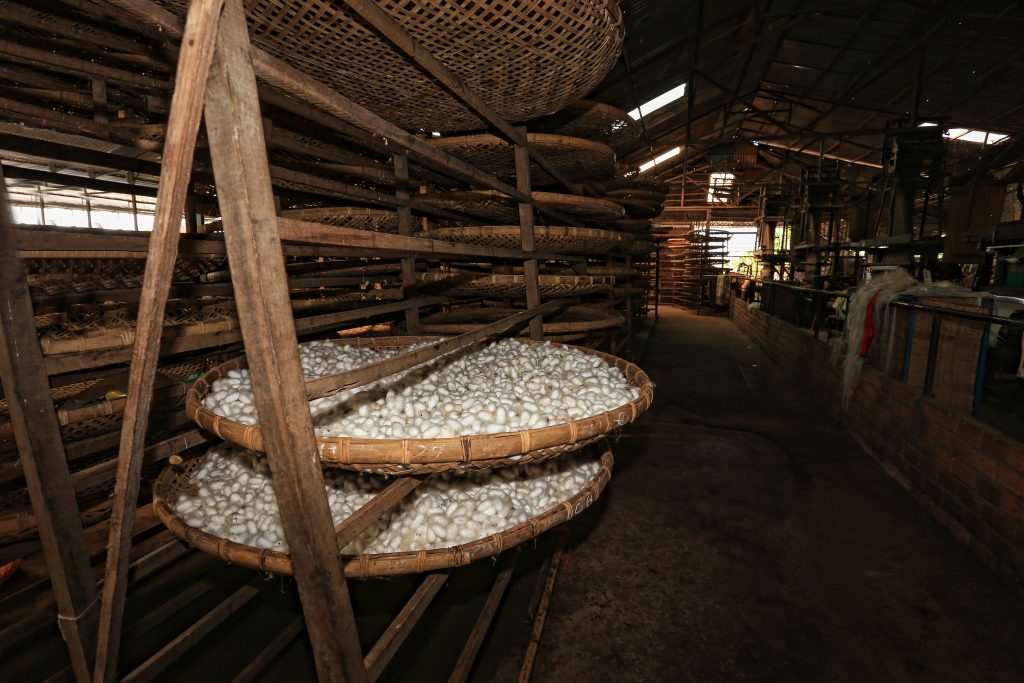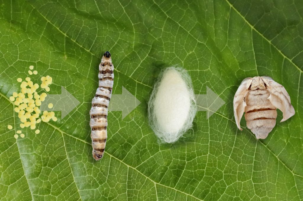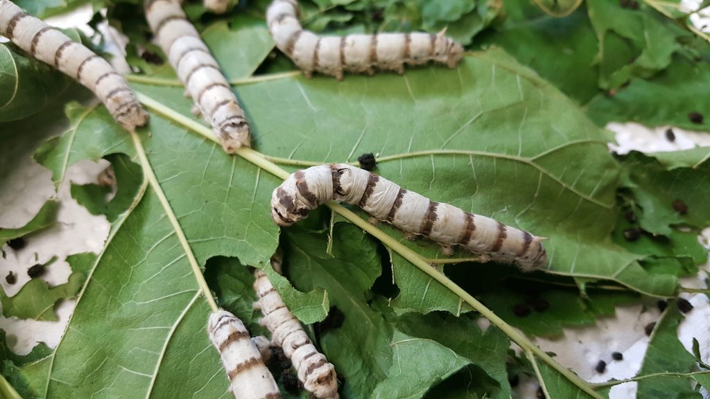 The farming process begins with a fecundated female moth laying between 300 and 400 eggs before dying, which then incubate for 10 days or so. Then, small caterpillars emerge, who are kept captive in boxes on layers of gauze with chopped mulberry leaves. After feeding from the leaves for about six weeks (consuming around 50,000 times their initial weight) the so-called silkworms (although they are not technically worms, but caterpillars) attach themselves to a frame in a rearing house, and form a silk cocoon during the next three to eight days. Those who survive then pupate to become adult moths, who release an enzyme that breaks down the silk so they can emerge from the cocoon. This effectively would “spoil” the silk for the farmer as it would make it shorter, so the farmer kills the moths by boiling or heating them before they begin secreting the enzyme (this process also makes it easier to reel the threads). The thread will be further processed before it can be sold.